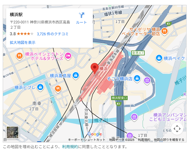 https://www.google.com/maps/embed?pb=!1m18!1m12!1m3!1d3249.5543120154894!2d139.6199079262239!3d35.465826791776024!2m3!1f0!2f0!3f0!3m2!1i1024!2i768!4f13.1!3m3!1m2!1s0x60185c0df6cfd2f1%3A0xbbbca6f36b5235f5!2z5qiq5rWc6aeF!5e0!3m2!1sja!2sjp!4v1760941509957!5m2!1sja!2sjp